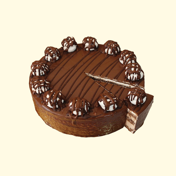 Ingredients: Delicious chocolate cream from liquid chocolate and sour cream between cocoa plates, covered with chocolate glaze, decorated with white sour cream and a couverture